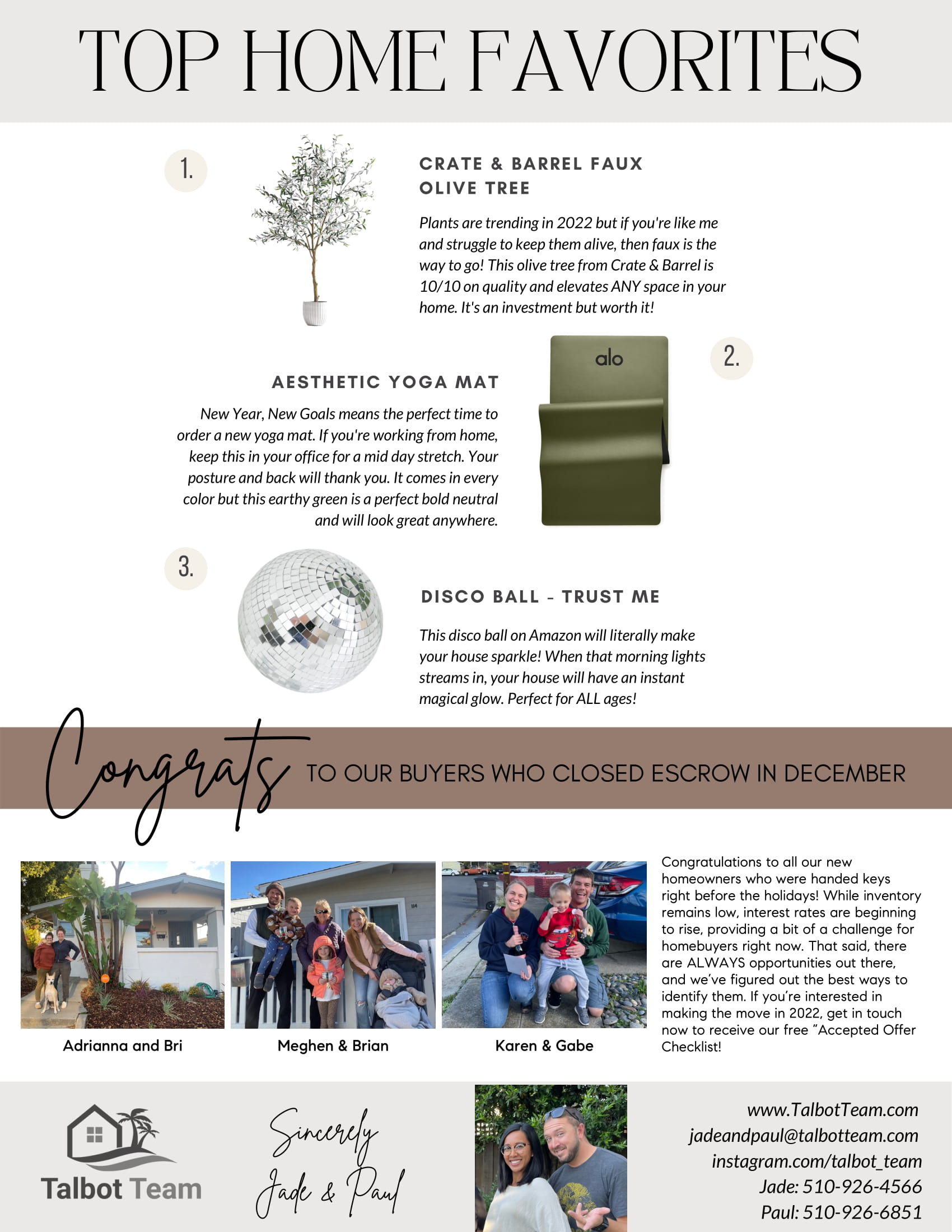 We are extremely communicative, tech-savvy, and knowledgeable of the latest market and design trends. In addition, we are one of the few Green Certified real estate teams in the Bay Area.